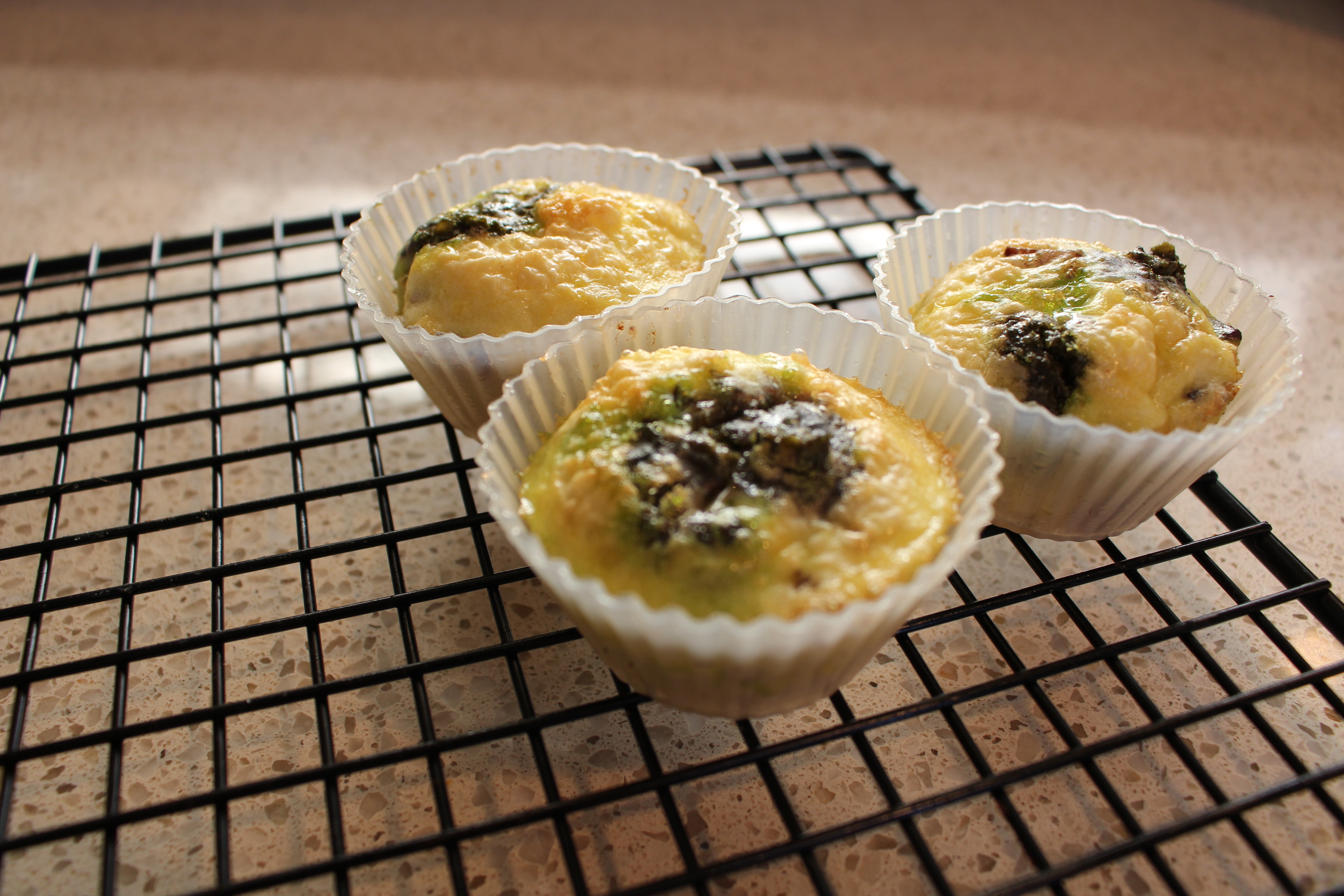 Whisk eggs with seasoning, and pour into muffin cups over bacon and pesto.