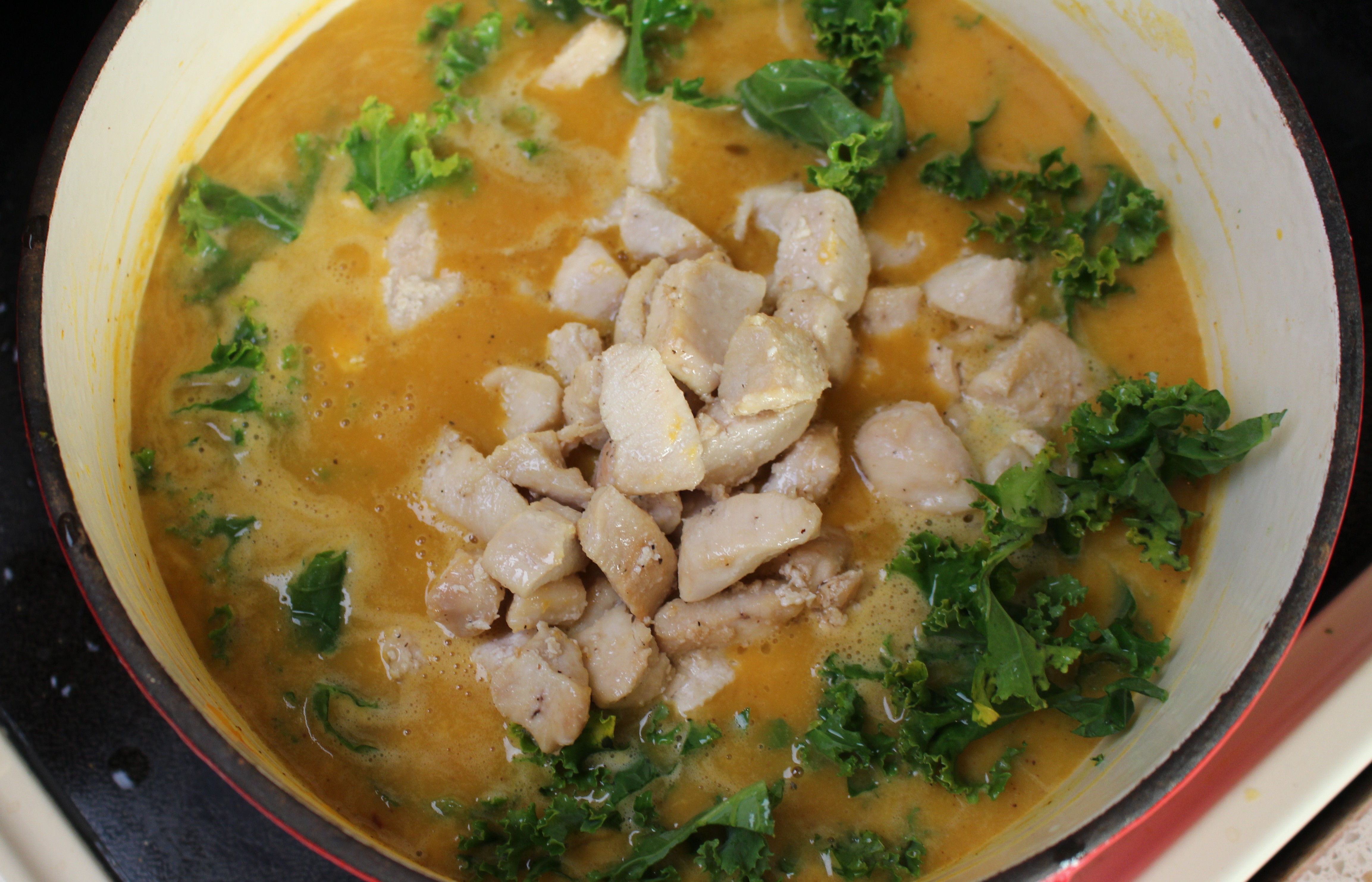While squash bakes, cube chicken and cook on medium with 2 tbsp oil. Combine coconut milk and broth in soup pot, cook for 5 mins to combine. Remove cooled squash from skin. Add squash and seasonings to broth. Puree soup with (ideally) an immersion blender. Cook for another 5 minutes. Add cut up Kale. Bring to slow boil. Add chicken, drop temperature to low.