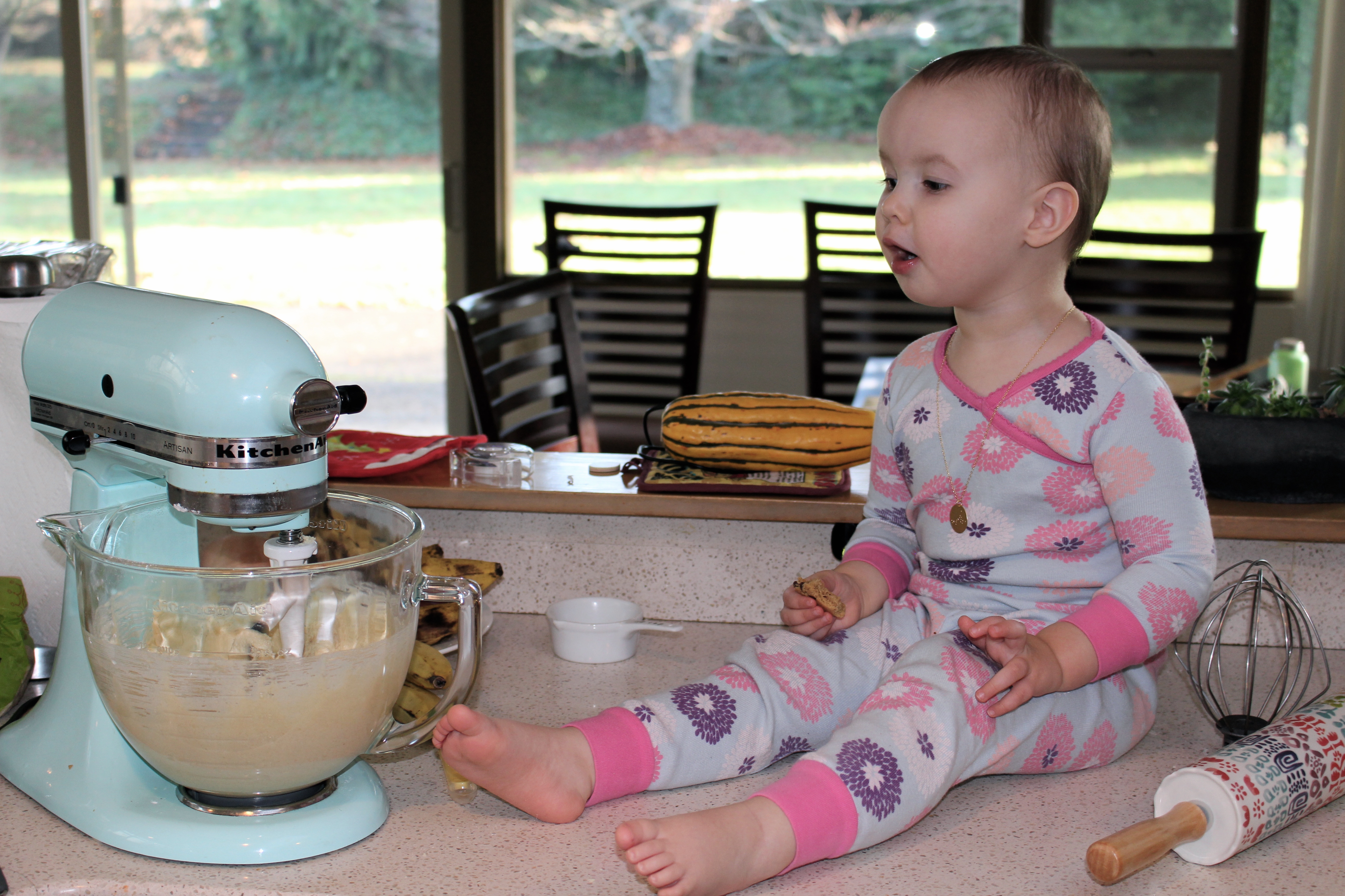 To help cut down on my bacon cooking time I line a cookie sheet with parchment paper and put a layer of bacon down. I bake it in the oven at 425 degrees for 12-15 minutes. That way I don’t have to worry about turning it or even have to think about it until the buzzer goes off. While the food is cooking I will give our daughter a piece of fruit to tide her over so she doesn’t die of starvation while she waits.