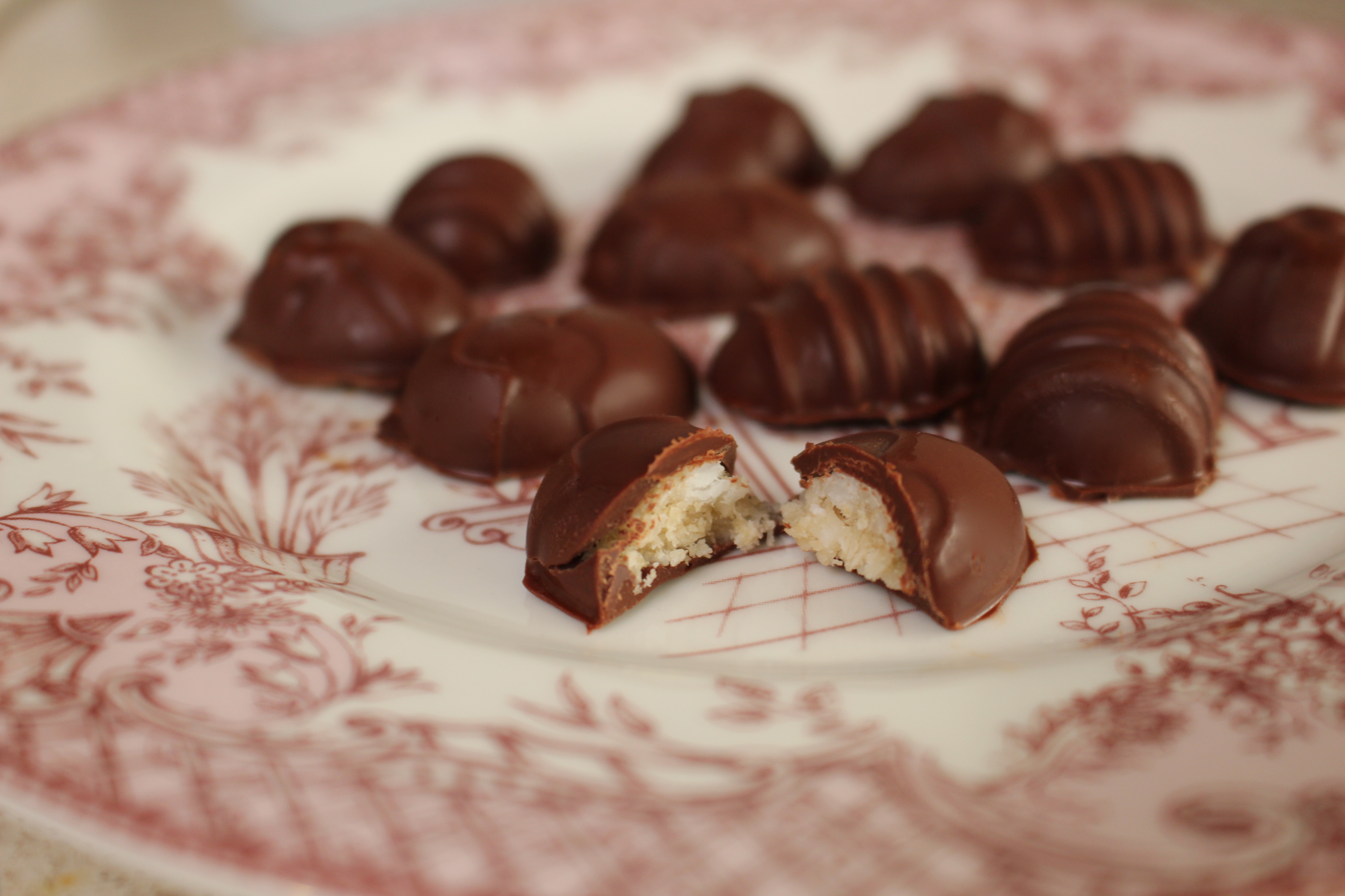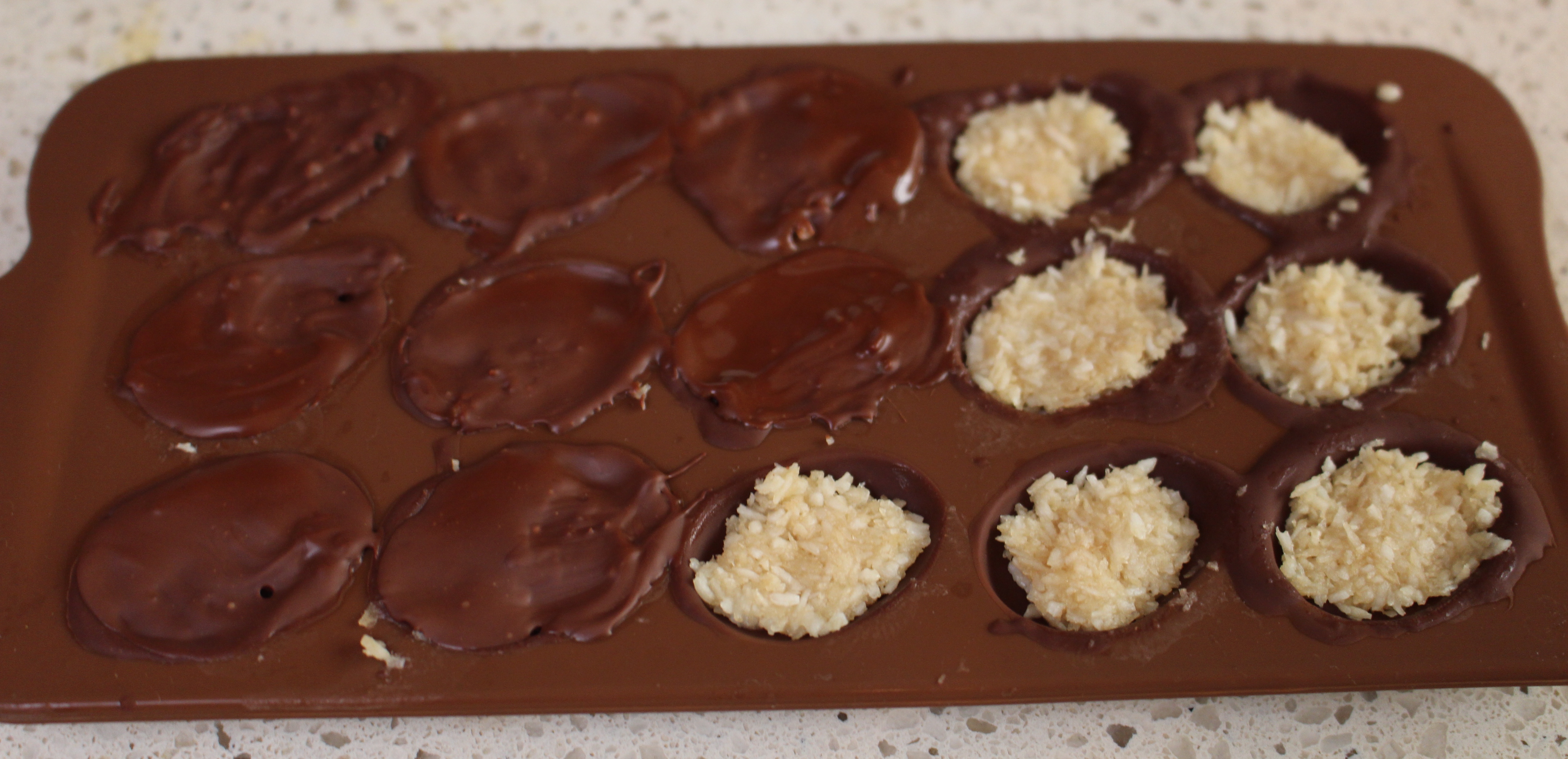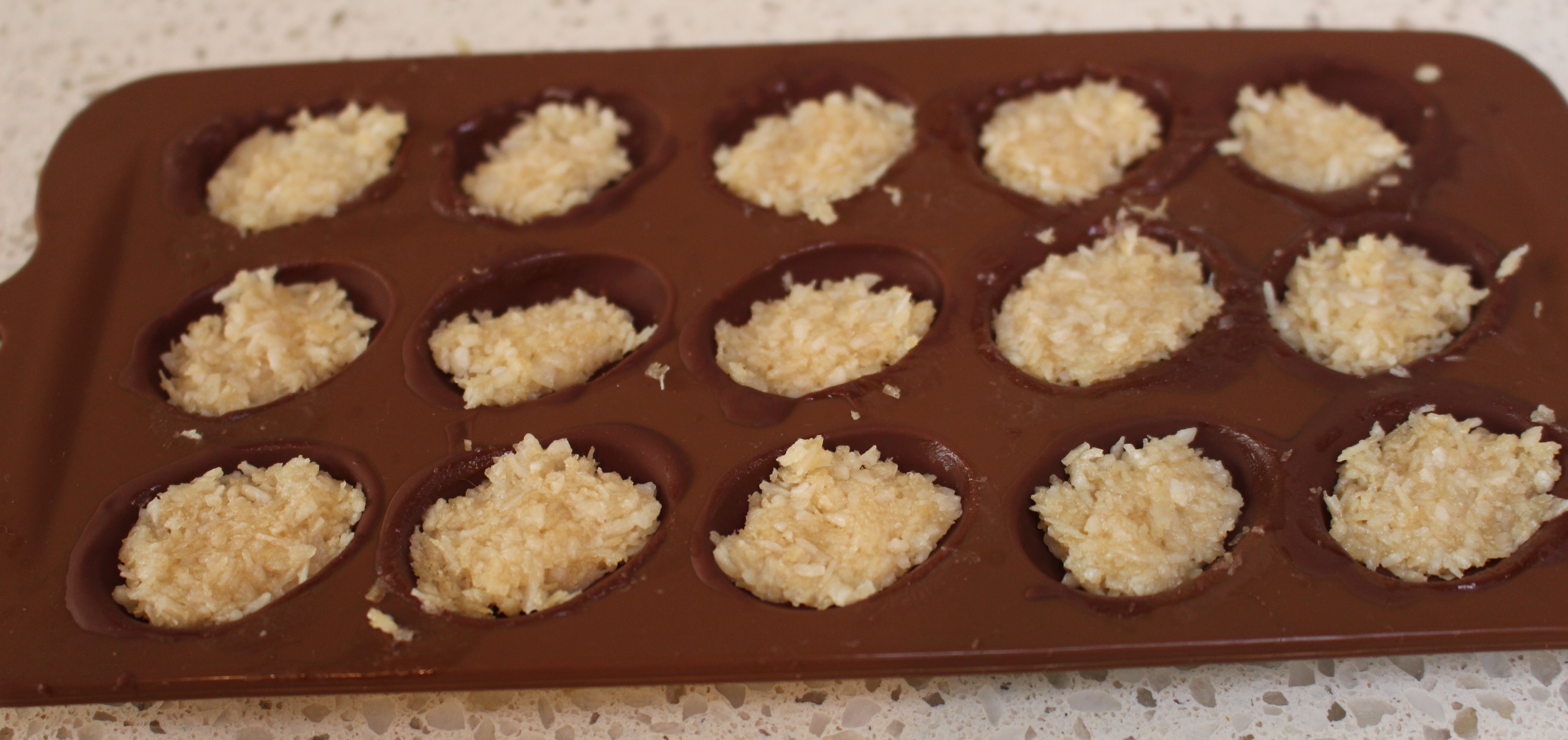 Using a double broiler melt your chocolate chips and palm oil over a medium low setting, stirring frequently. While the chocolate is melting mix together your filling. Place all of the filling ingredients in a small bowl (it is not necessary to melt the coconut oil first) and mix together by hand and set aside. Next, using a small brush, coat the insides of the candy mold. Place in the freezer for 5 minutes to set.