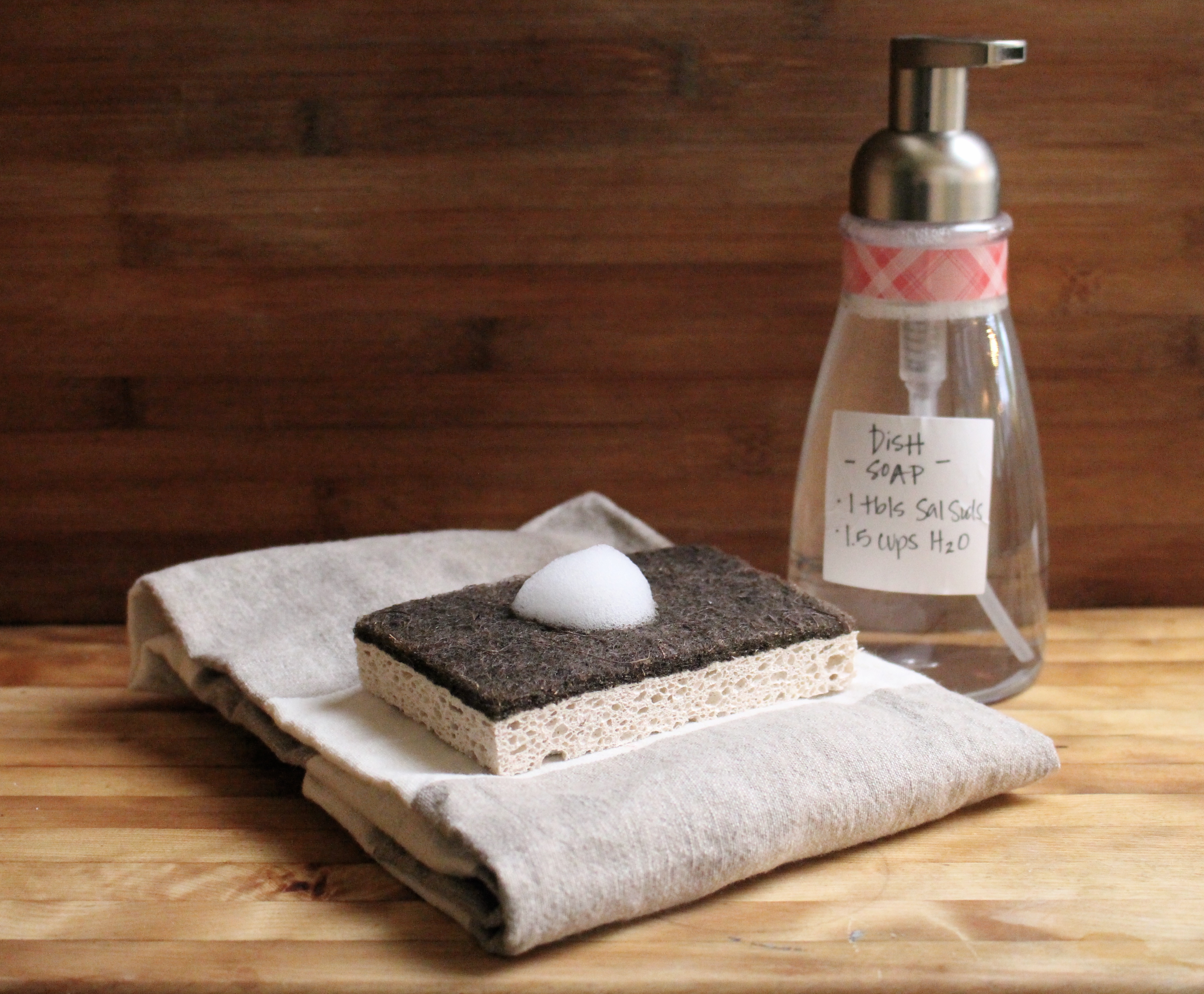 This dishwashing soap is so easy to make and it cuts through the grease and gunk great! It is made with Dr. Bronner’s Sal Suds formula which is so concentrated that you only need just 1 tablespoon to make 12-16 ounces of Soap. You will definitely want to invest in or repurpose a foam soap dispenser to make this formula. You will end up overusing and wasting the liquid soap if you use a squeeze bottle as you need just one or two pumps to scrub a pan which is barely any liquid.