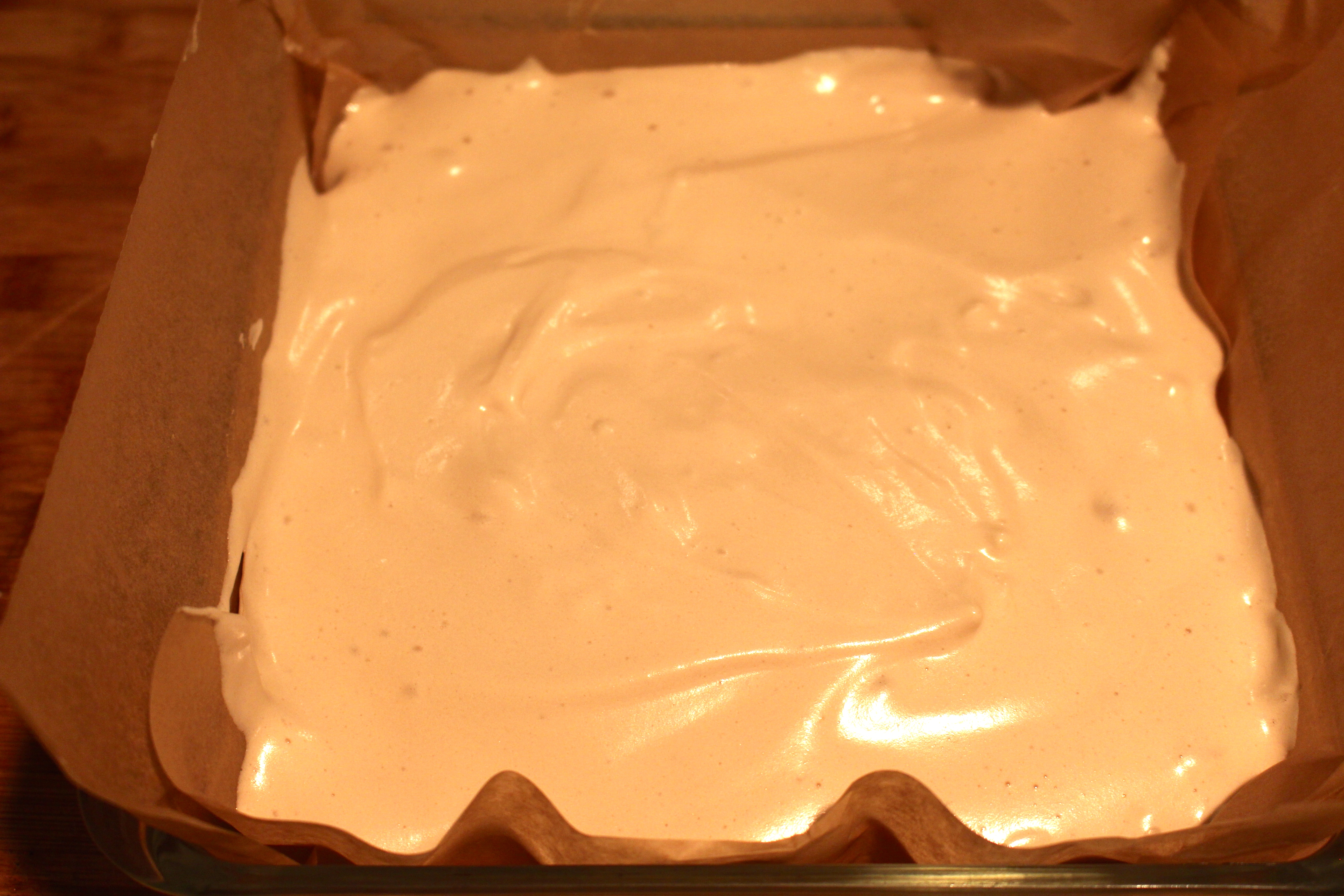 While that is whipping, line a 9×9 pyrex/baking dish with parchment paper so that all surfaces are covered. This stuff is seriously sticky and hard to work with until it sets.