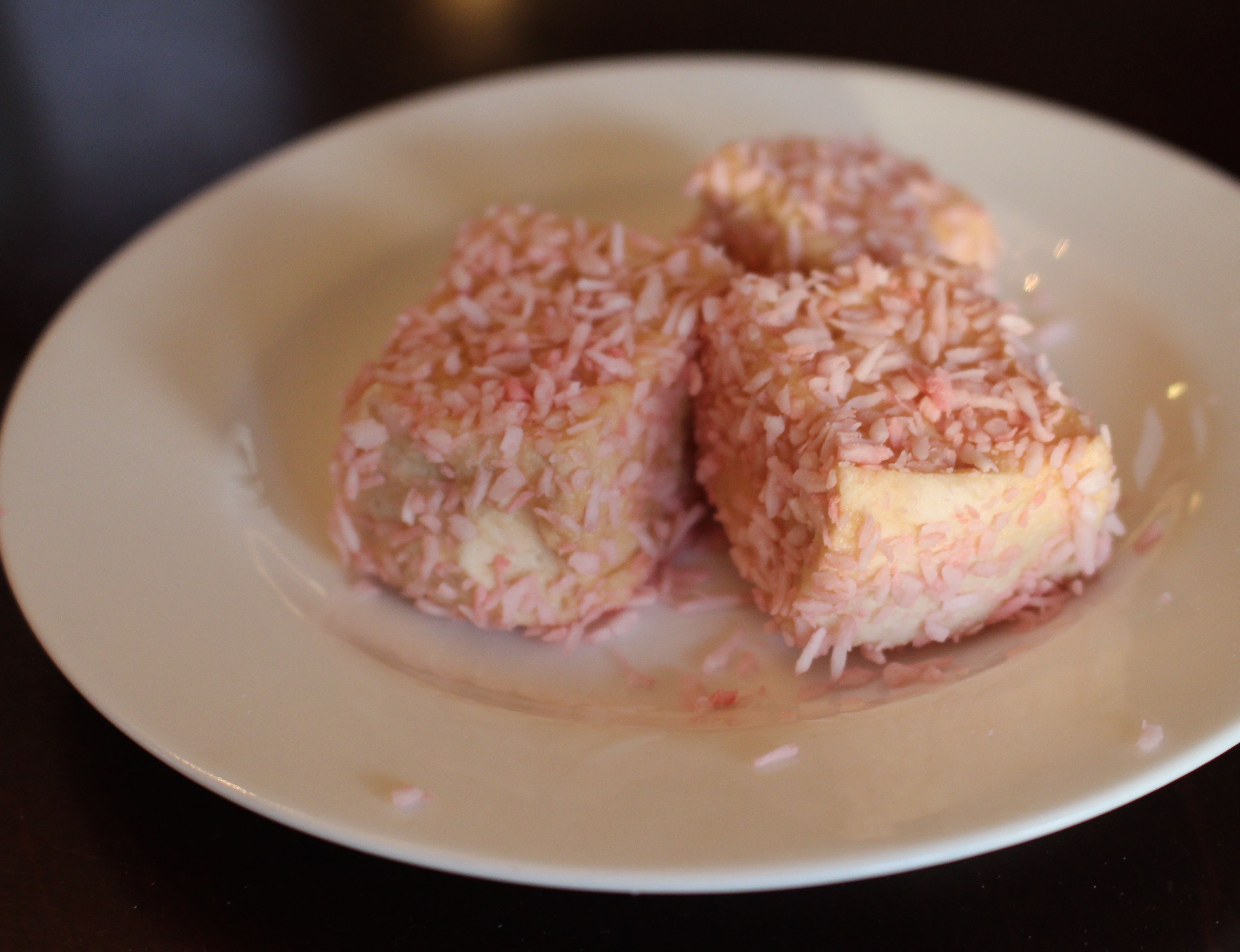In a small food processor or blender, blend the ingredients together for 20 seconds and place into a shallow bowl. After the marshmallows are cut, dip your fingers in a little bowl of water and coat each marshmallow lightly before rolling in the coconut.