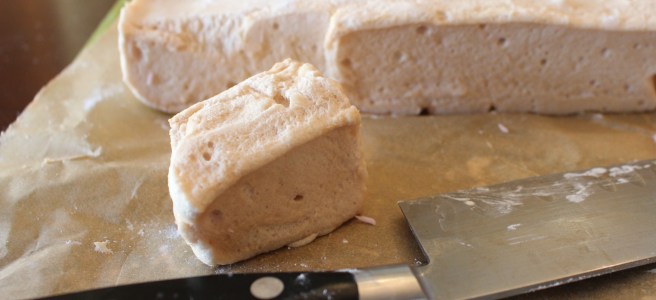 Now for the fun. After it has set out overnight, remove your marshmallows from the baking dish and separate the parchment paper from the sides by slowly pulling away. You will notice the marshmallows stretching and returning to their shape as the pull away. Trim your marshmallows into squares and you are ready to enjoy!